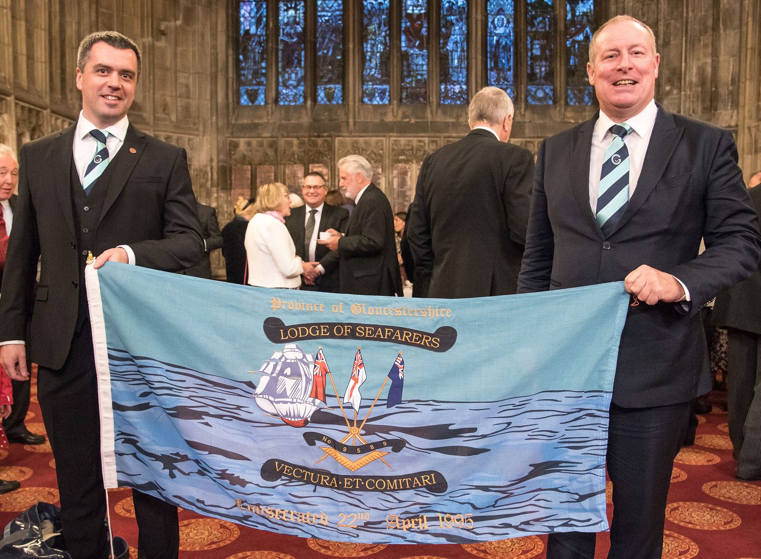 The WM from the Lodge of Seafarers attended the recent Gloucester Cathedral service where he proudly displayed the ‘ship’s flag’ – ably assisted here by